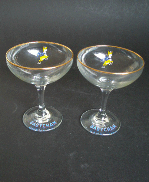 Dating to the 1970s is this pair of babycham glasses with the leaping yellow deer. These have round stems, a gilt rim and BABYCHAM in blue written to the base.