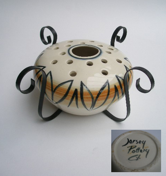 Here is a fabulous retro 1960's posy/ bud vase from the renowned Jersey Pottery. It has sixteen small holes for the flower stems and a larger central hole. It has a hand-painted wash of sienna bands around its middle with black outlined leaf shapes. It sits in a black metal stand which springs out to remove the pot, which means it can be used alone if desired. Hand-painted to the base Jersey Pottery C.I.(Channel Islands)
