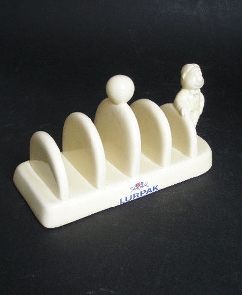 Here is a Lurpak toast rack with the Douglas mascot at the side. It holds four pieces of toast. This was originally designed for advertising Lurpak butter and are now quite collectable. It has the LURPAK logo to the front and is marked to the base MADE EXCLUSIVELY FOR LURPAK.