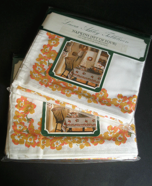 Dating to the 1970s are these eight unused Laura Ashley 100% cotton napkins. They are still in the original packets with four in each. The cotton has an easy care finish and the approximate finished size of each is 51x51 cm / 20 x20 ins. They are a cream colour with a blossom border in shades of light oranges.