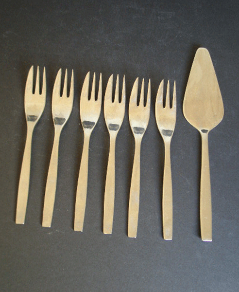 Dating to the 1960s is this set of six stainless steel pastry forks and a small cake lifter by Viners in the Chelsea design. Marked to the handles VINERS OF SHEFFIELD ENGLAND 18/8 STAINLESS STEEL.