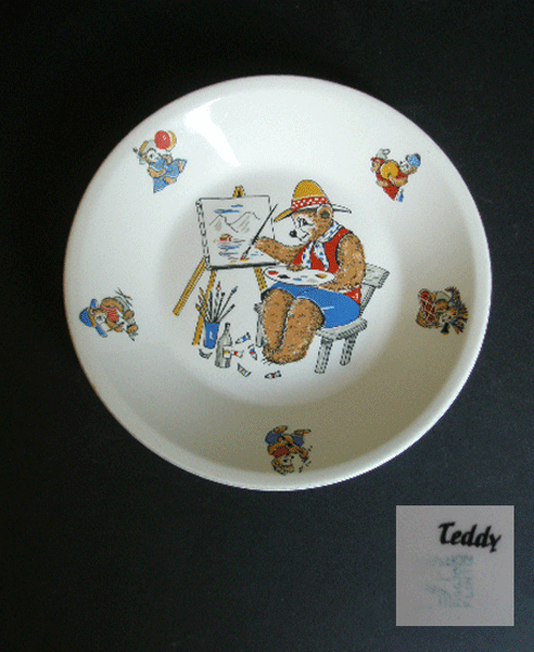 dating to the 1970s is this childs shallow bowl by Figgjo Flint of Norway. It is called Teddy and has a central design of a teddy bear painting a picture. Around the outside are smaller images of bears playing with balloons, playing the guitar, having a picnic, painting in a sketch book and in an Indian headdress. Marked to the base TEDDY with the FIGGJO FLINT NORWAY mark.