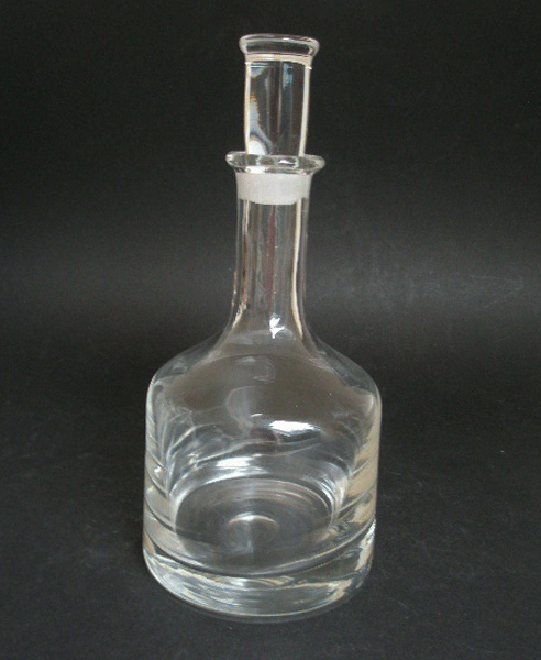 Here is a fabulous, very heavy decanter designed by the renowned Frank Thrower for Dartington glass in 1968. It is design FT44 and has a typical sixties simplistic shape with a long stopper which stands nicely upright to avoid rolling off the table. It has a polished out pontil mark on the heavy base. This design was so popular that it carried on into the 1980s.