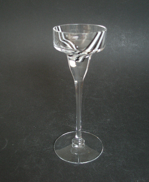 Dating to the 1990s is this pretty candle or tealight holder by Caithness glass. It is in the Charisma pattern first designed by Colin Terris in 1987. This has black and white stripes running through the bowl of the candleholder which was called the Midnight colourway. Etched to the base CAITHNESS