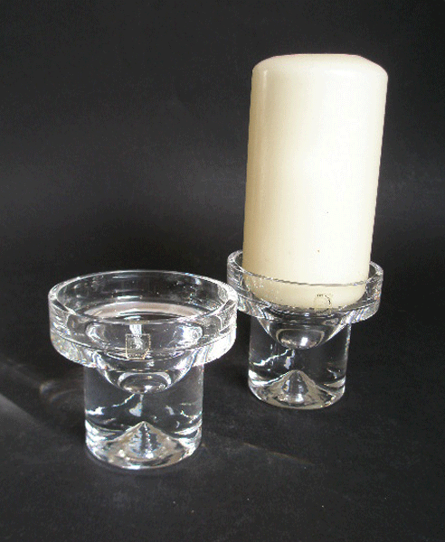 Dating to 1967 is this pair of heavy candleholders by Dartington Glass. They are part of the Dimple Suite (FT10) designed by Frank Thrower and nicknamed -Blaze Away. They have a dimple in the heavy base. Both have the original Dartington gold square stickers. The square sticker indicates they were made between 1967 and 1968.