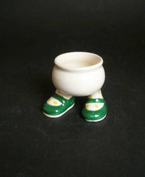 Dating to the 1970s is this Carlton Ware egg cup. It is part of the Walking Ware range and has green shoes with yellow spots on white socks. Marked to the base CARLTONWARE ENGLAND.