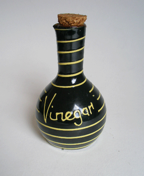 Dating to the 1950s is this fabulous retro piece of pottery from the Babbacombe Pottery. It has a raised yellow swirled line from top to bottom with a break for Vinegar and is on a black glazed background. The inside has a yellow glaze. It has a cork stopper. A great item to have on display and to use. Marked to the base BABBACOMBE POTTERY LTD MADE IN TORQUAY DEVON