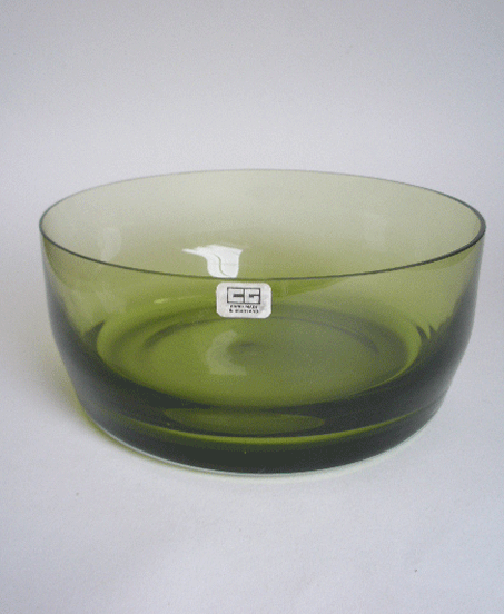 Here is a moss green heavy glass fruit bowl by Caithness Glass. This still has the original sticker reading C G MADE IN SCOTLAND.