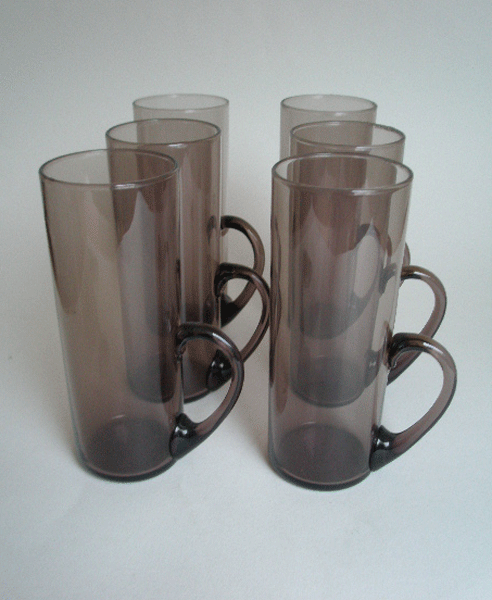 Dating to 1961 is this rare set of six tankards designed by the renowned Domhnall OBroin for Caithness Glass. These are in the peat colourway and catalogued no. 4004.