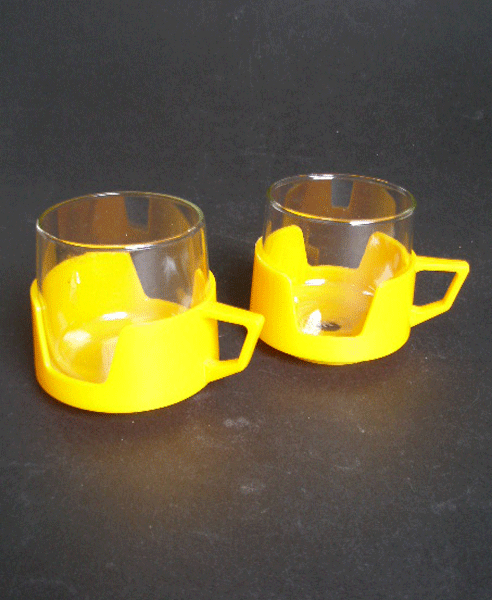 Here is a pair of Drink-ups cups in bright yellow plastic holders The tempered heat resistant glass comes out of the holder and can be used as a tumbler. Ideal for picnics or campervans. They also stack well. Marked to the base JAJ MADE IN ENGLAND and PYREX