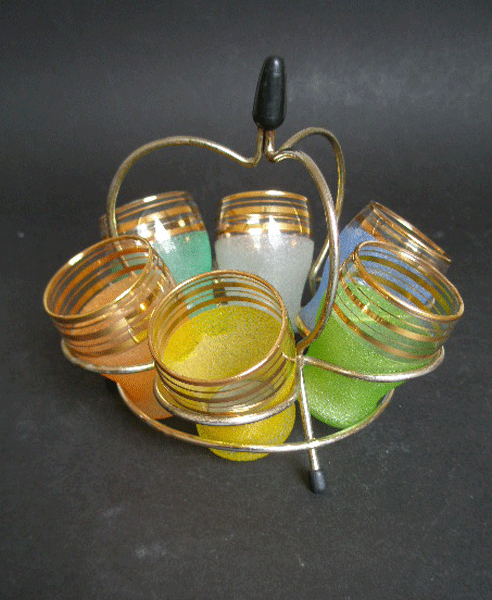 Dating to the 1960s is this set of six different coloured textured glasses in a caddy. The stand is metal and has three feet with black plastic tips and a central black plastic tip to the handle. The glass colours are in textured white, sea green, peach, yellow, lime green and blue. They have gold banding to the top of the glasses. The blue one is the same shape and size but has an extra gold band round the centre. A great retro set.