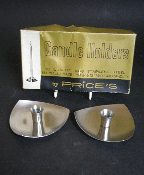 Dating to the 1960s is this pair of triangular stainless steel candleholders. They were specially made by Price for Mayfair Candles. These were tall taper candles. These are still in their original box and packaging. Marked to the base PRICES 18/8 STAINLESS STEEL EMPIRE MADE