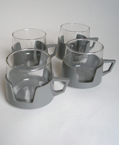 Here are four vintage Drink-ups cups in grey plastic holders. The tempered heat resistant glass comes out of the holder and can be used as a tumbler. Marked to the base of the holders JAJ.(Price is for the four)