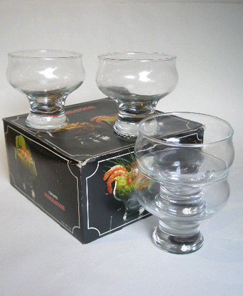 Dating to the 1970s or thereabouts is this set of four glass bowls by Durobor of Belgium. They are in the Fascination design and still in the original retro box. The box depicts four uses for the bowls. They are Shrimp Cocktail, Amuse- Gueule, Dessert and Mousse. The bowls are quite large, a great shape and have a heavy base. (we have another set of these).Marked to the box FASCINATION 4 GLASSES DUROBO MADE IN BELGIUM.