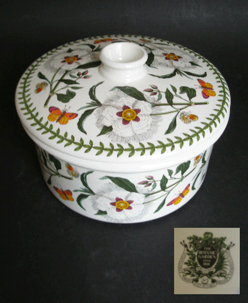 Dating to the 1970s is this Botanic Garden casserole dish by Portmeirion and designed by Susan Williams-Ellis. The floral motif is the Spanish Gum Rose which was first introduced in 1972. It has the older backstamp which states that it is DISHWASHER PROOF, OVEN TO TABLE, FREEZER AND MICROWAVE SAFE.