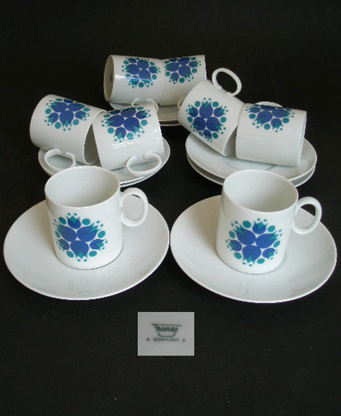 Here is a set of eight coffee cups and saucers by Thomas of Germany. They date to the 1970s or thereabouts and are in the blue and green pinwheel design. Marked to the base THOMAS GERMANY.