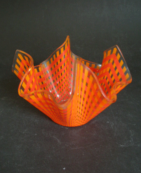 Dating to the 1970s is this gingham handkerchief vase by Chance Glass. It is in the striking colours of red and orange.