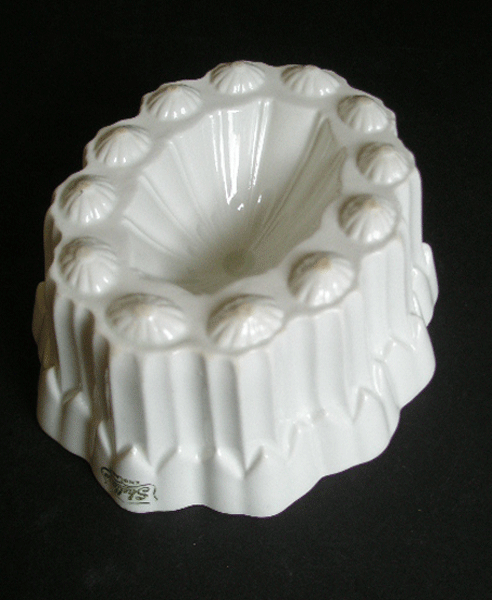 Dating to the 1920s is this white ceramic mould, for pate or jelly, by Shelley. It is oval in shape and in the very ornate Savoy design. Marked to the side SHELLEY ENGLAND.