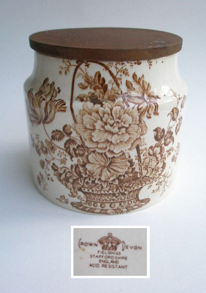 This is a large storage jar from the renowned Crown Devon Fieldings Staffordshire pottery. A Victorian style floral design in browns, back and front the same, brings antique charm to this lovely storage pot. It has a wooden lid. Marked to the base in brown with CROWN DEVON FIELDINGS STAFFORDSHIRE ENGLAND ACID RESISTANT.
