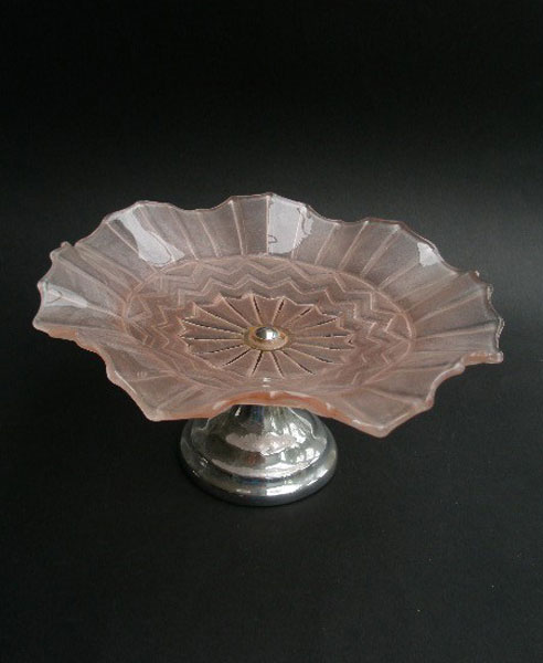 Here is a pretty pink glass cake stand smooth to the surface and ground to the underside and patterned with zig-zags and diagonals.It has a chrome-plated screw in stand which makes it easy to wash. Great way to serve small cakes, scones, biscuits or sliced sponge and very attractive on display.