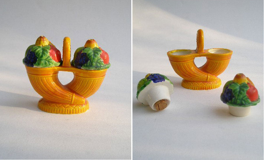 Dating from the 1920s/1930s is this Japanese, ceramic, Marutomoware salt and pepper set in the shape of a double cornucopia of fruit. The fruit lifts out as the shakers and each has a small cork underneath as the stopper. It has been Hand Painted and is still in its original vibrant colours. Very collectable, to have on display or to use. Marked to the