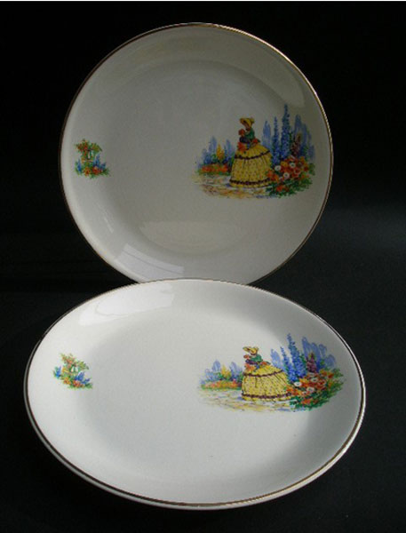 Here is a pair of crinoline lady dinner plates dating from the 1950s or thereabouts by Alfred Meakin.These have a gilt rim. Fabulous. Marked to the base with the crown ALFRED MEAKIN ENGLAND.