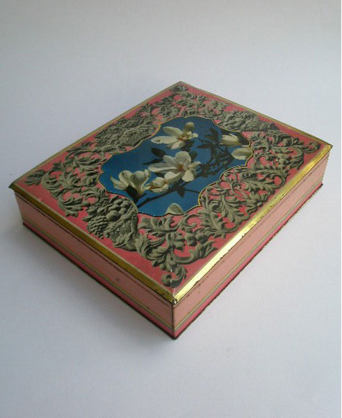 Dating from the 1950s or thereabouts is this Edward Sharp tin with a double layer hinged lid. Edward Sharp and sons were famous for their toffee tins and this one would have held loads of toffees. It is large enough to hold 20 fairy cakes/ buns and would be useful for this purpose. In lovely shades of pink and bands of gold with a sprig of white blossom reflected in an ornate mirror, this is a fabulous vintage piece. It has a gold-tone interior. Could equally be used for other storage purposes. Marked to the base Made in England by Edward Sharp & Sons Ltd. of Maidstone Kent.