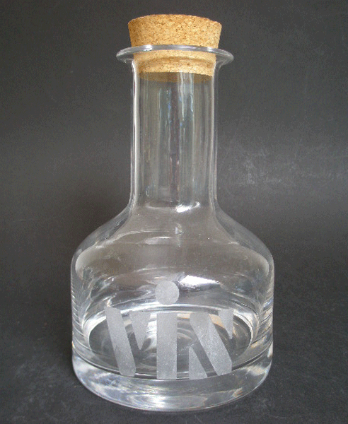Here is a Dartington clear glass wine carafe designed by Frank Thrower in 1971 and nick-named the -follow the vin decanter. It has VIN etched to the front in large letters and has its original cork stopper. This has a very heavy base and is in a thick lead crystal glass. Great retro piece for serving wine at the table.