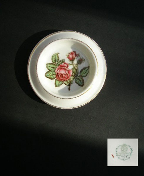 This is a chunky heavy pin dish by Wedgwood with a pink rose handpainted design to the centre and gilt rims.