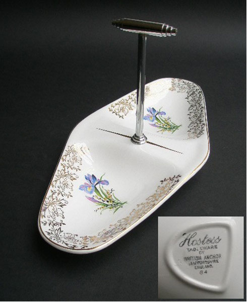 Here is a sturdy two sectioned conserve dish by British Anchor as part of their Hostess Tableware range. It is diamond in shape with a chrome screw in handle to the centre. It has a gilt floral pattern to the edges and an Iris to the centre of each section.Marked to the base Hostess TABLEWARE BY BRITISH ANCHOR STAFFORDSHIRE ENGLAND G4