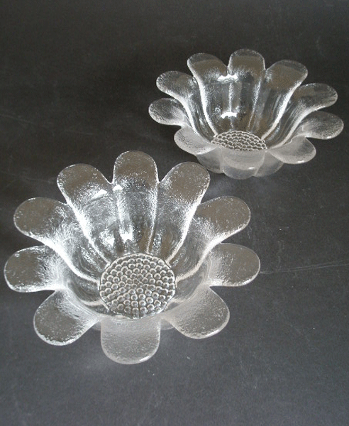 Designed by the renowned Frank Thrower and handmade by Dartington Glass, England is this pair of dessert bowls from the 1970s Daisy collection. These were advertised as - Just Desserts - on the 1977 Dartington poster.They are textured to the underside and smooth on the upperside and catch the light wonderfully. Very heavy, stunning pieces of glass and great to use.