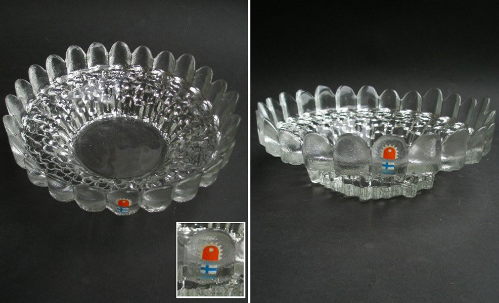 Here is a heavy glass bowldating to the 1970s, by Pertti Santalahti for Kumela glassworks in Finland. It is heavily textured like icicles to the under- side and smooth to the inside. The outer rim resembles petals.This is a stunning piece and looks good on display or in use.It still has the original label stating KUMELA MADE IN FINLAND.
