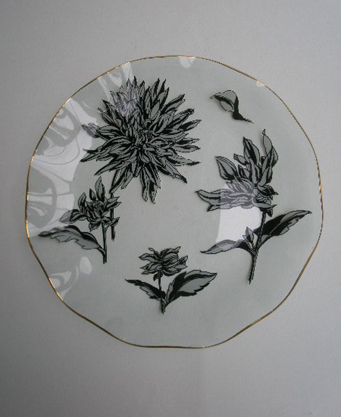 This is an unusual design called Silhouette brought out by Chance Glass in 1967 during the flower power era. It is in black and white and the fluted edge is gilded. This was intended as a cake plate but is also a very decorative piece.