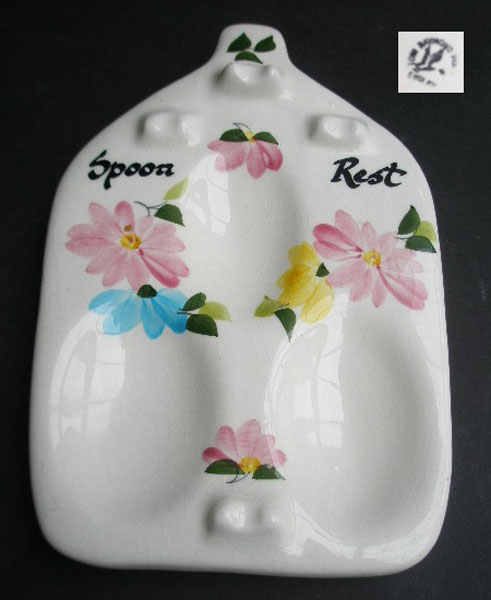 A fabulous piece of studio pottery by Toni Raymond dating from the 1960s in the form of a spoon rest with a pretty hand- painted design of pink blue and yellow flowers. It has enough room for three or four spoons to rest in the hollows and handle rests. It is scribed with Spoon Rest in black . A superb piece for a Toni Raymond collector or lover of quality retro kitchenalia. Looks great on display and very functional. Marked to the base TONI RAYMOND POTTERY ENGLAND with the flying goose logo.
