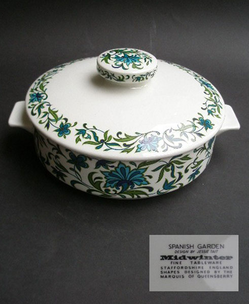 Here is a lidded vegetable or serving tureen by Midwinter in their popular Spanish Garden pattern, designed by Jessie Tait in the 1960s.Marked to the base SPANISH GARDEN DESIGN BY JESSIE TAIT Midwinter FINE TABLEWARE STAFFORDSHIRE ENGLAND SHAPES DESIGNED BY THE MARQUIS OF QUEENSBERRY.