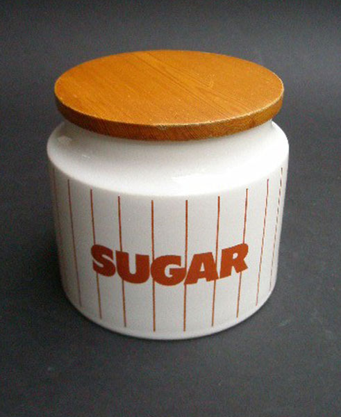 Here is a very retro sugar storage jar in light brown stripes from the renowned Hornsea Pottery. It has SUGAR written on it and a tight fitting wooden lid to keep your sugar fresh. Marked to the base HORNSEA ENGLAND.