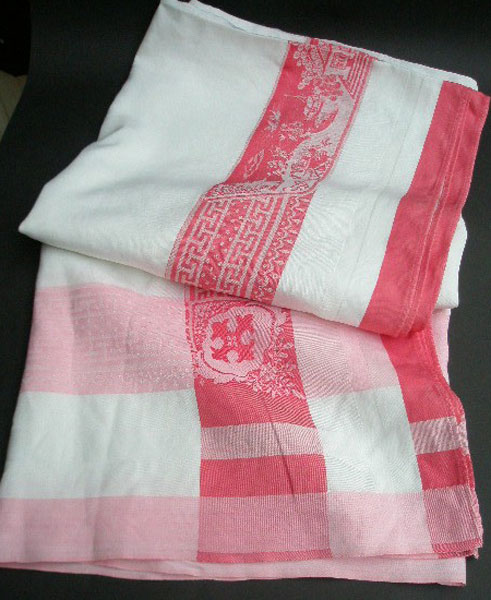 1930s DAMASK ORIENTAL TABLECLOTH WITH ROSE PINK BORDER