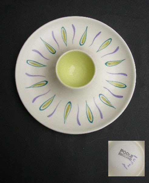 In a very contemporary handpainted design is this lovely 1950s egg cup stand in the much sought after design UFW. This easily compliments the twintone lime yellow tableware of the same era.The central well for the egg is lime yellow. This is all in one piece and the usual good quality. Marked to the base POOLE ENGLAND and the signed mark UFW plus impressed numbers 104.