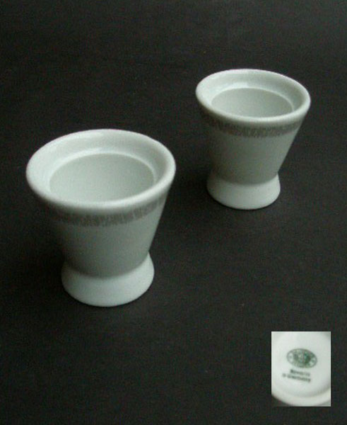 Here is a pair of Weiden porcelaine egg cups in white with a simple graphic design around the top. Marked to the base BAUSCHER WEIDEN Bavaria Germany in green.